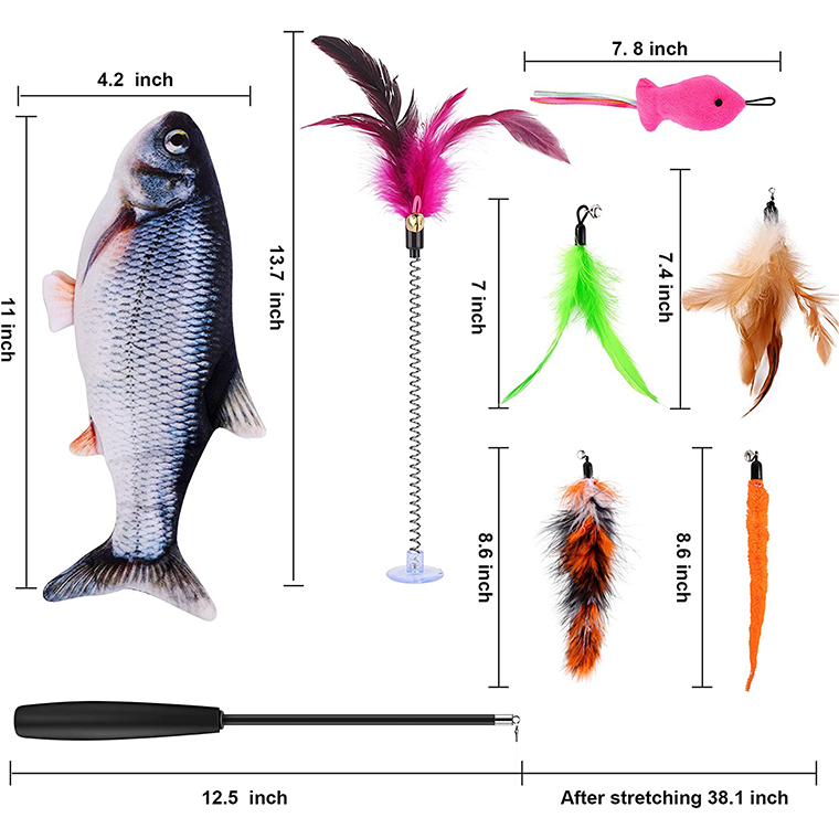 This Cat Toys Set Includes 1 Flopping Moving Fish Toy with Built-in Touch Sensor, 1 Fishing Rod, 6 Replaceable Feathers, 1 Pack catnip and 1 Interactive Cat Toy with Bouncy Toy. Your Cat Will Definitely Love Playing with this 9 PCS Cat Toy Set.Realistic Fish Simulation. This Automatic Moving Fish Toy Looks Like a Real Fish, An Eye-Catcher for Your Cat. The Plush Interactive Fishing Toy is Perfect for Your Cat to Play.The Electric Fish and the Cat Fishing Toy is Made of High Quality Durable Plush Fabric. Safe to Human and Pets.