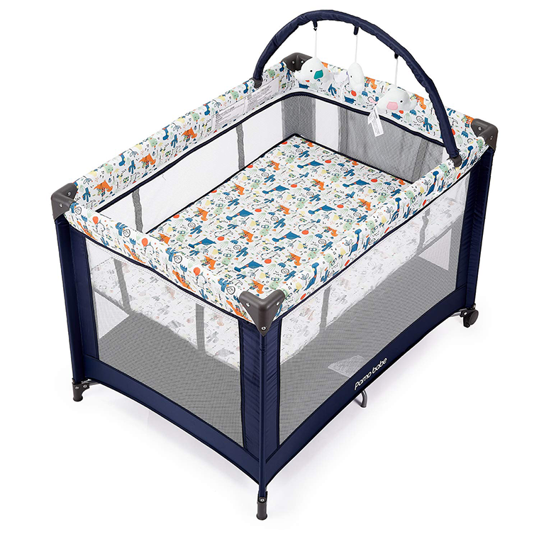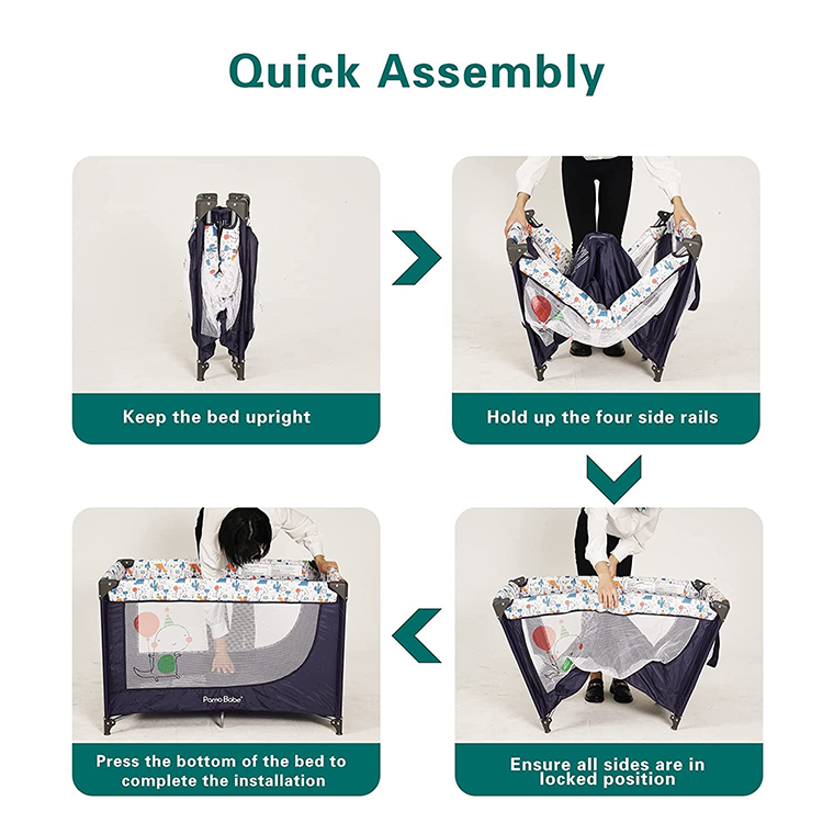 The bassinet bed can be easily removed from the baby playard. The baby travel playard is compact and doesn’t take up much space. A carry bag is convenient for storage and transport,the travel cot fits in the trunk of a car and is perfect for travel.If you have limited living space, you are definitely going to fall in love with this amazing playard.The breathable mesh fabric ensures visibility, healthy air flow and guarantees a peaceful slumber for your baby.The portable travel cot is suitable for birth to 33 LBS of kids.For utmost convenience, the baby travel playard does not require extensive setup and can be stored away or reassembled in mere minutes. Just snap the bassinet’s frame in place and the crib is ready for use. Easily collapsible as well, it takes just seconds to pack away or reassemble, without any stress or complicated steps.